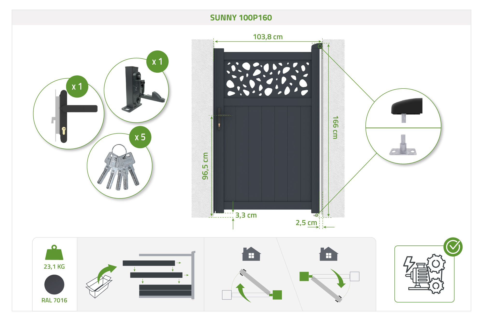 Dai carattere al tuo ingresso con il cancello DOLOMITE SUNNY. Il suo pannello decorativo orizzontale, impreziosito da motivi a ciottoli, conferisce un tocco di design contemporaneo che fa la differenza. Questi motivi giocano con la luce creando un effetto visivo unico, preservando al contempo la tua privacy. Realizzato in alluminio grigio, combina robustezza e leggerezza per un risultato elegante e durevole. Che si tratti di una casa moderna o di un giardino contemporaneo, il DOLOMITE SUNNY si distingue come un ingresso di grande impatto.