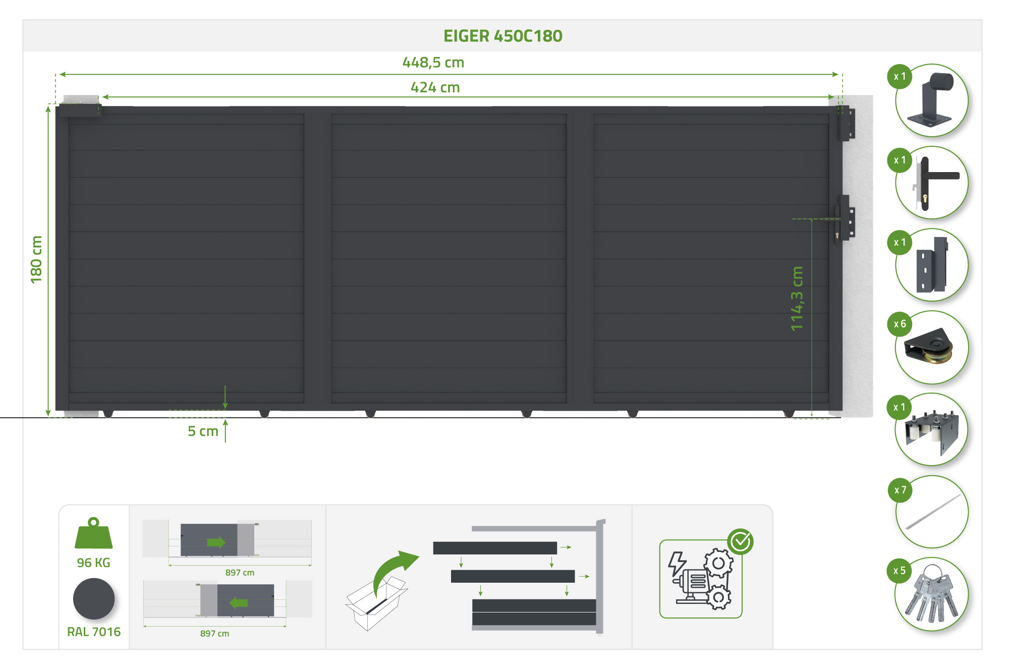 Cancello scorrevole EIGER 4,5 m, altezza 180 cm, alluminio grigio 11